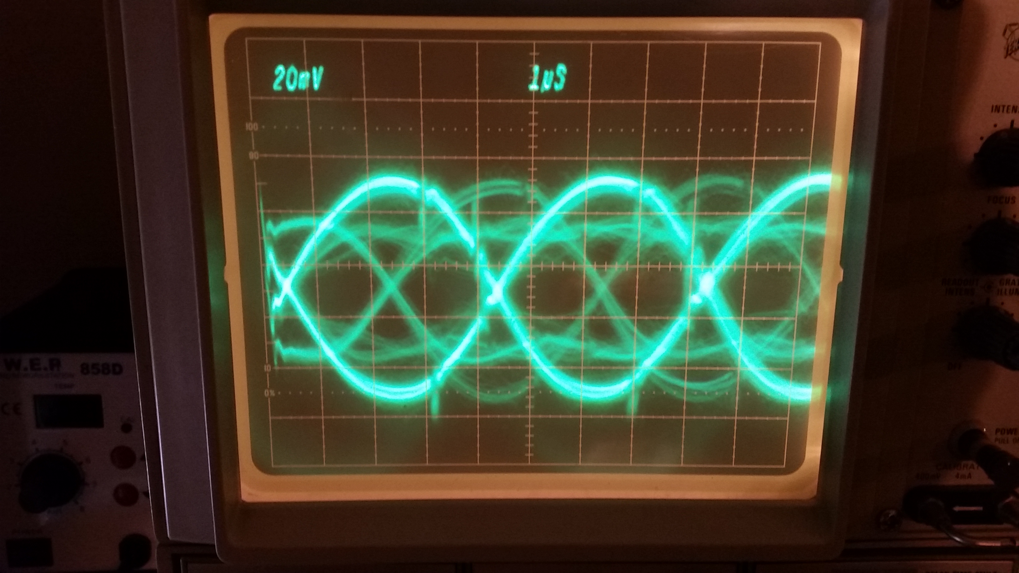 This picture show a typical signal. It is present only when the computer reads from the disk. Without the Olivetti original test disk, I wrote a simple BASIC program that continuously reads the directory of the disk ("files" command), ignoring any error. They will occur when the disk is out of alignment. I set up my oscilloscope as 1µs/div horizontal and 20mV/div vertical.